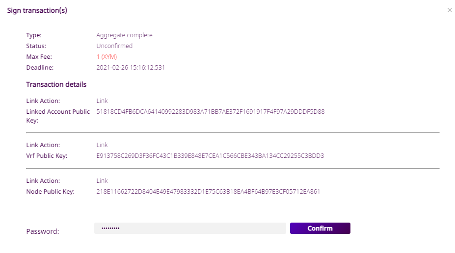 - 永続的デリゲートリクエスト (特別なタイプの 転送 トランザクション) に署名してアナウンスするには、最後にもう一度パスワードが必要です。
