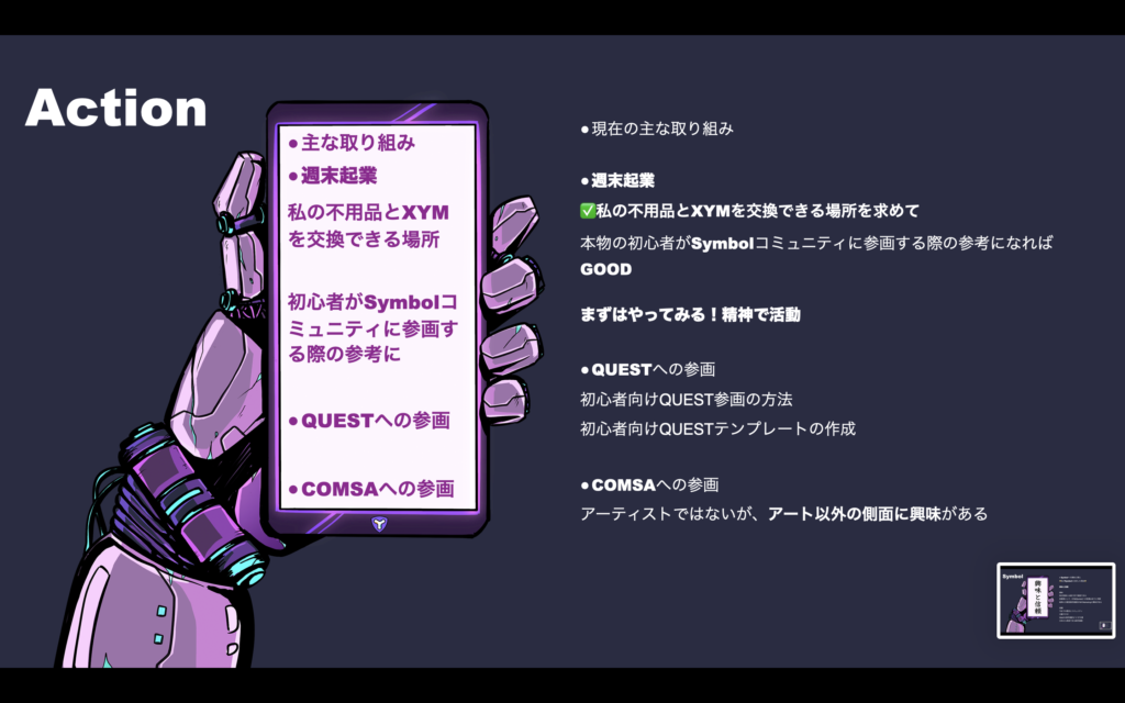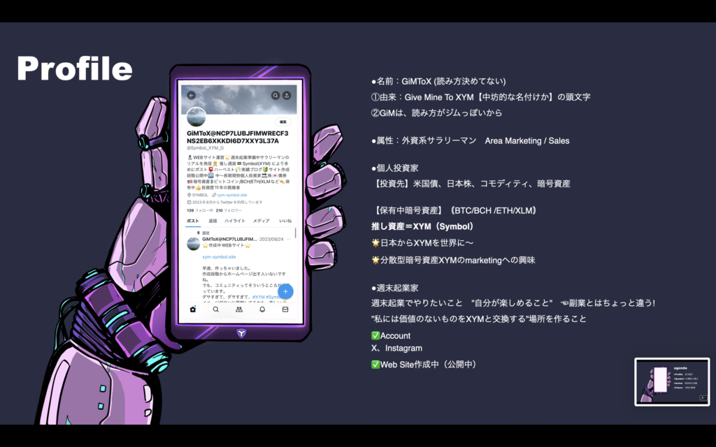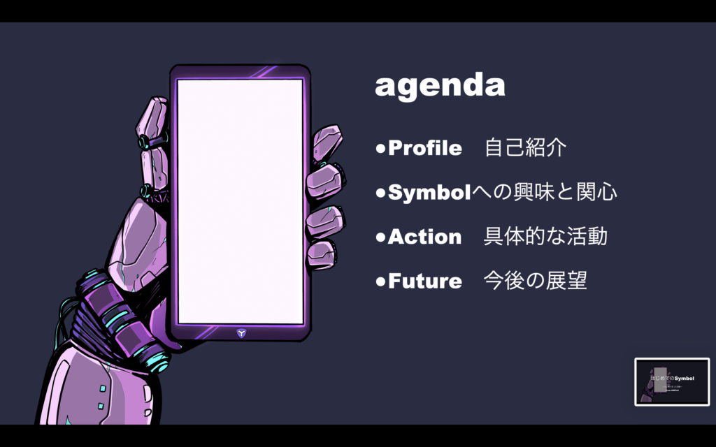 agendaは、本当にチープなagendaでございまいたが、主に自己紹介、Symbolへの興味と関心、具体的な活動、今後の展望についてお話しいたしました。