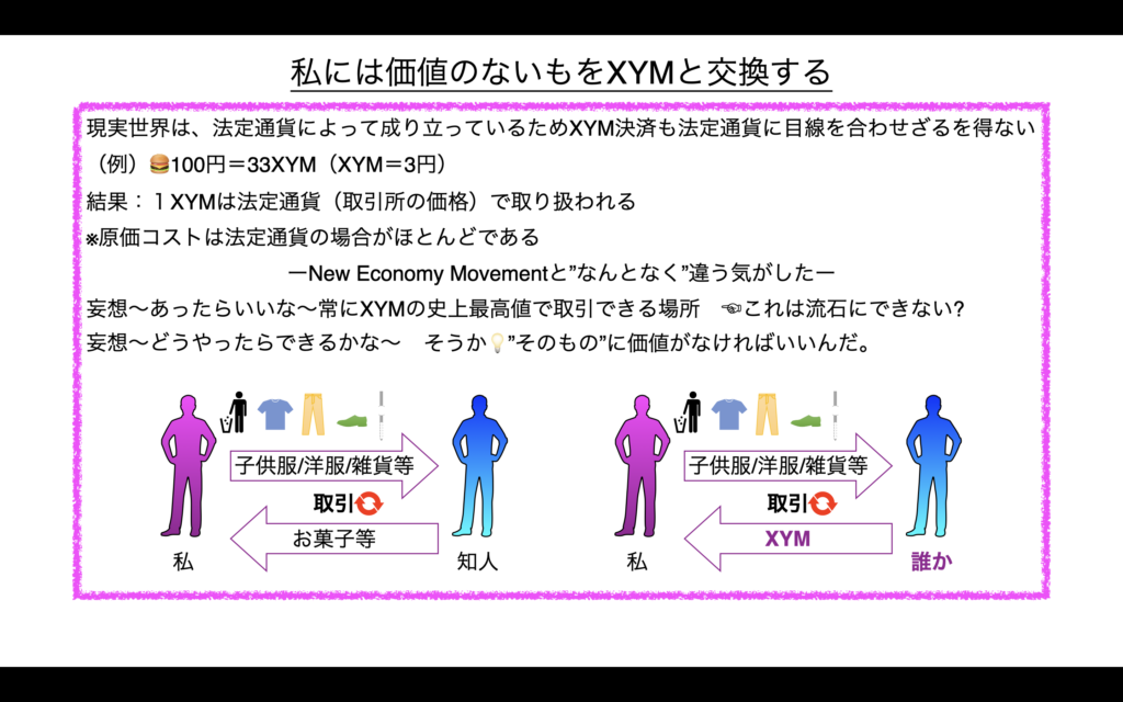 メインで紹介させていただいたものは、「私の不用品とXYMと交換できる場所を作りたい」というものですね。