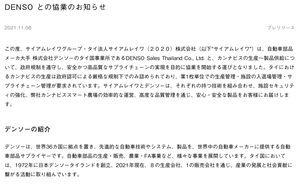 - デンソーはQRコードを開発した企業であり、部品製造のハードウェアだけでなくソフトウェアでも高い技術を持っています。そのデンソーが得意とする認証管理技術、センシング技術と、サイアムレイワのパブリックチェーンSymbolを基盤としたトラッキングシステムを用いて、栽培エリアや工場全体のセキュリティの強化及び品質保証の強化を実施予定です。