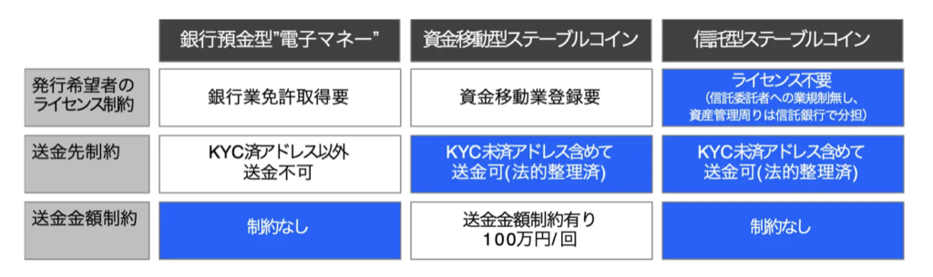 2023年6月施行の改正資金決済法上、SC(電子決済手段)は下記の3つを想定している。