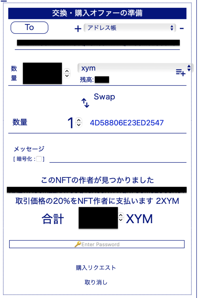 確認できたら、パスワード(NFT Drive EXへのアドレスインポートもしくは新規作成時のパスワード)を入力し、購入リクエストを押します。