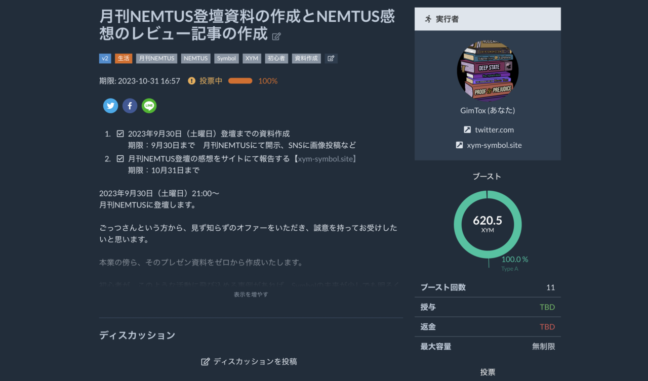 資料作りを取り組んで、620.5XYMをいただくことができました。